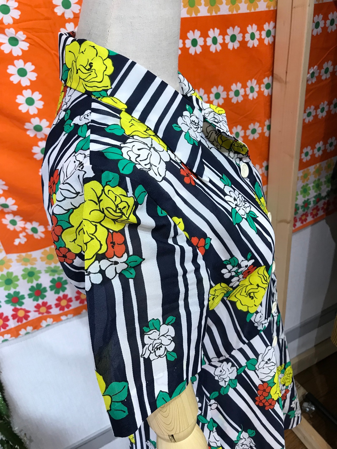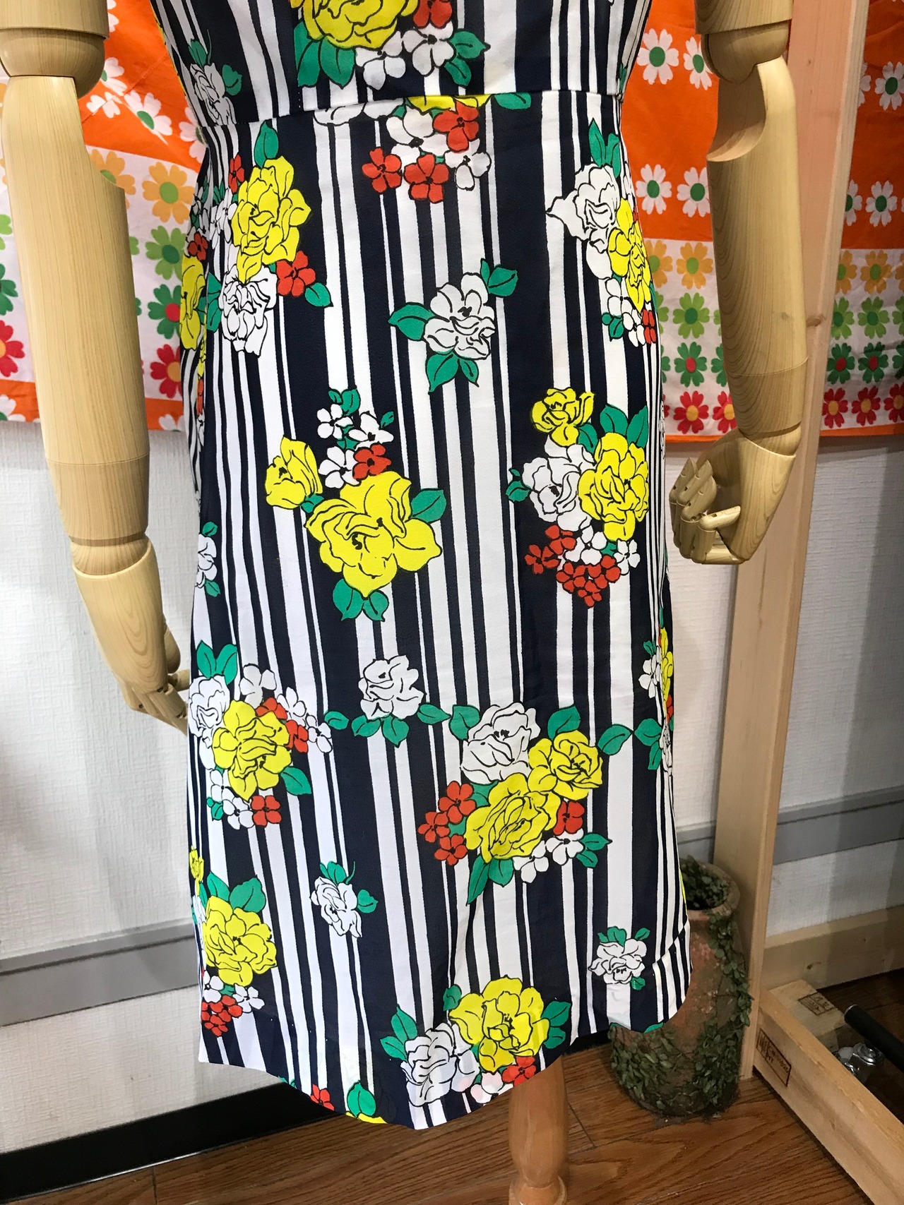 昭和レトロ古着 ストライプにカラフル薔薇柄ワンピ